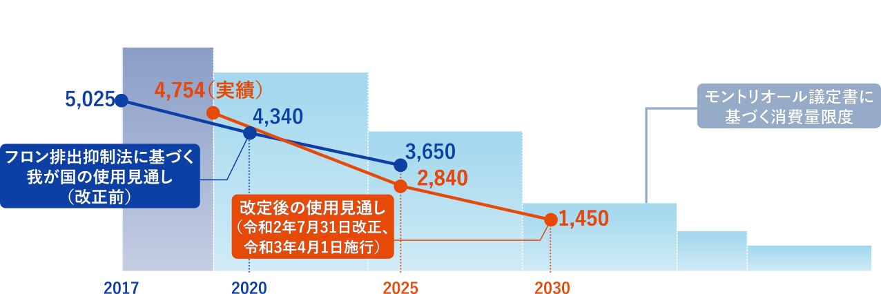 業務用冷凍空調機器の冷媒に用いられるフロン類は「地球温暖化」に大きな影響を及ぼすことから国際的に対策が進められています。2016年の第28回締約国会合(MOP28)では代替フロンの生産量・消費量の段階的な削減が義務付けられました。日本では2019年から削減を開始し、2036年までに基準値の85%分を削減するとともに、より温室効果の小さな冷媒への転換が必要です。