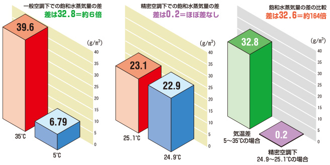 温度差5℃から35℃と、24.9℃から25.1℃の精密空調下では、飽和水蒸気量の差は、約164倍となります。