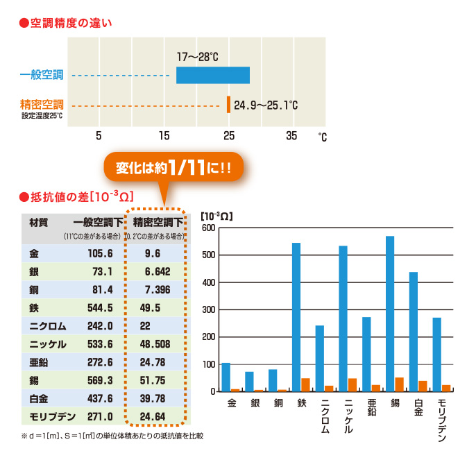 温度によって変わる電気抵抗。一般空調下と精密空調下において、その変動幅に大きな差が生じることが明らかになっています。