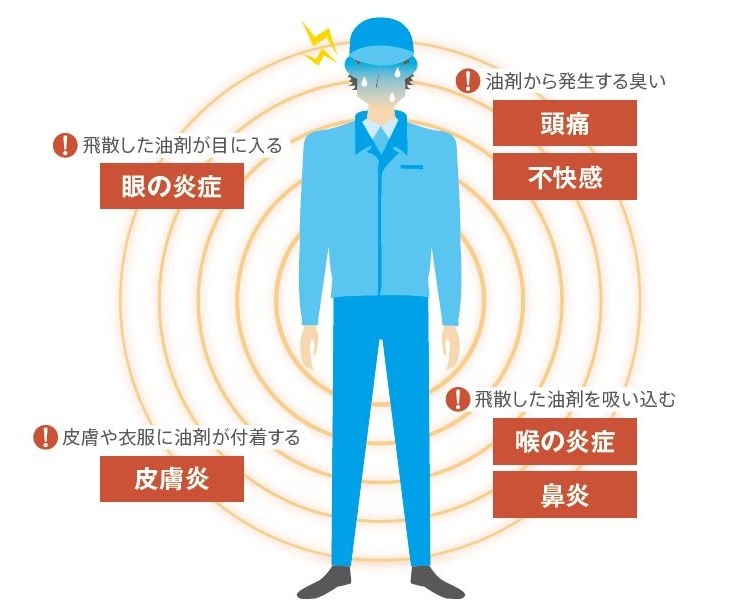 切削油剤は、作業環境に大きな影響を与えます。切削加工時などに飛散する油剤(オイルミスト)によって、床や壁などが汚れることはもちろん、油剤を取り扱う人や加工作業をする人も、油剤に触れることで健康に影響を受けてしまいます。