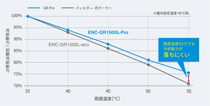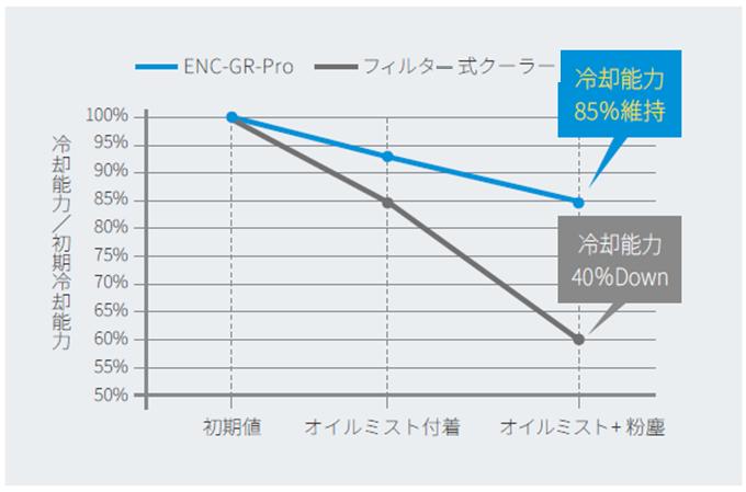オイルミストと粉塵を凝縮器に付着させて冷却能力を評価。フィルター式クーラーの能力が40%も低下する状況において、GR-Proシリーズでは、85%の冷却能力を維持します。