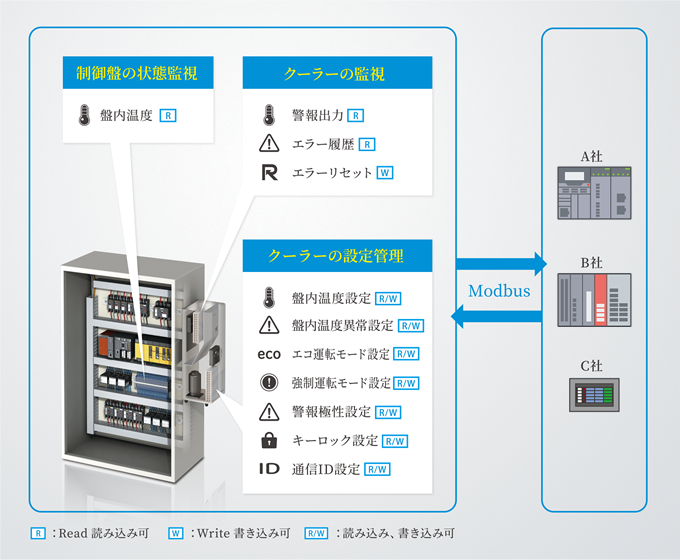 製造現場のIoT化要望が高まるなか、読み書き対応の外部通信Modbus/RTU通信(RS-485)を制御盤用クーラーで初めて標準搭載しました。1台の制御機器に対して最大32台まで接続でき、温度の集中監視や、タッチパネル・PLCからの設定変更なども可能です。