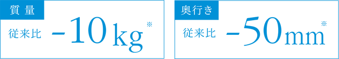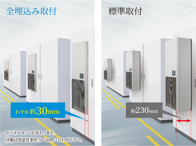 従来の当社フィルターレスクーラーと比較して10kg※の軽量化を実現。制御盤の強度に対する懸念や取付工数の低減が見込めます。奥行きも50mm※スリム化し、制御盤からのクーラーの“出っ張り”が減少しました。また、専用ホルダーなしで全埋込み取付が可能となりました。