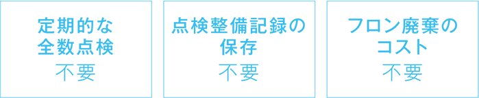 「フロン排出抑制法」の対象外で、指定業者による回収・破壊の必要や、定期点検の義務がなく、フロンによるコスト負担をなくすことができます。