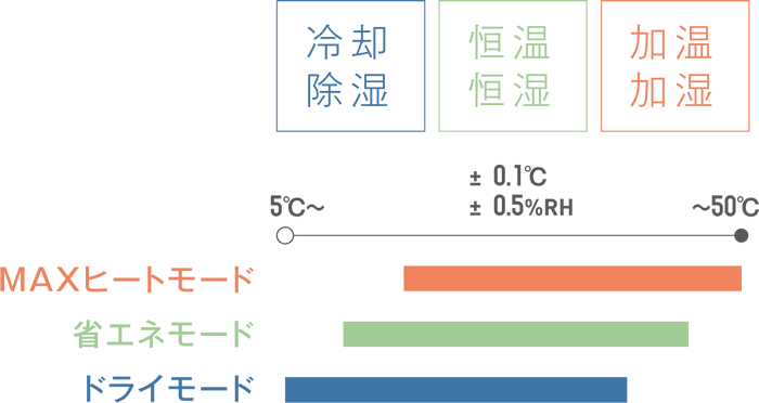 より省エネで恒温恒湿を実現できる"省エネモード"、冷却・除湿性能を最大発揮する"ドライモード"、加温・加湿性能を最大発揮する"MAXヒートモード"の3つのモードを搭載することで、恒温・恒湿、冷却・除湿、加温・加湿といったさまざまなニーズに対応します。