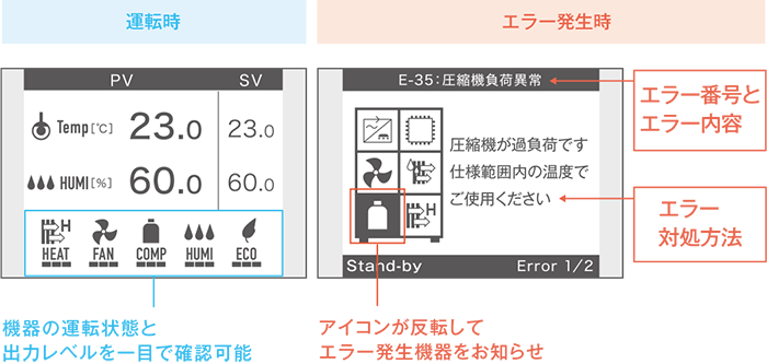 直感的に内容を理解できるアイコン表示により、運転状態が一目で分かることはもちろん、エラー発生時には発生箇所や対処方法まで表示。万一のトラブル時にも、スピーディな問題解決をサポートし、生産性を維持します。