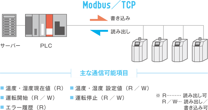Ethernet通信機能(Modbus/TCP)を標準搭載。TCP/IPプロトコルを用いてPLCやタッチパネル等の制御機器に簡単に接続でき、現在値のモニタリングや設定値変更・異常履歴の管理など、精密空調機の集中管理を、これまでにはなかった手軽さで提供します。