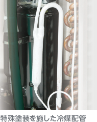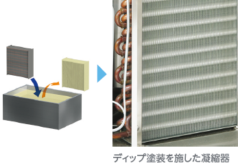 内部構造は凝縮器フィンをエポキシ樹脂で塗装。細部まで塗装を施すため、塗料槽に浸すディップ塗装・焼付け処理を行っています。また、冷媒配管にはメタルエポプライマー塗装を実施。究極の耐候性を実現しました。