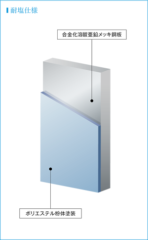塩害エリアでの使用も想定し、合金化溶融亜鉛メッキ鋼板の上から、耐候性の高いポリエステル粉体塗装を実施。また、ENC-AS1000HDS-DCでは、内装板金においても同様のポリエステル粉体塗装を施し、より高い耐候性を実現しています。