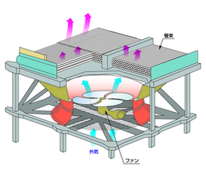 管束(フィン&チューブ等)とファンを基本構造とします。管束内にポンプで冷却対象の液体を流し、ファンで管束へ送風し、液体と空気の温度差によって液体を冷却します。