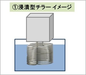 下図2.のように、冷却対象のタンクから直接冷却対象液体をチラー本体に取り込んで冷却するチラーです。配管をタンクに挿入するだけで冷却が可能となる容易さが特長です。