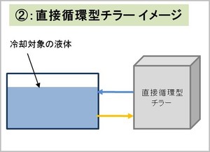 冷却対象の液体を直接冷却するチラーの方式について説明しています。