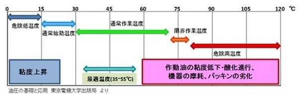 前項目のような悪影響を防ぐため、油圧作動油を冷却する必要があります。下図のように油圧作動油の適正温度35~55℃に保つのが理想となります。